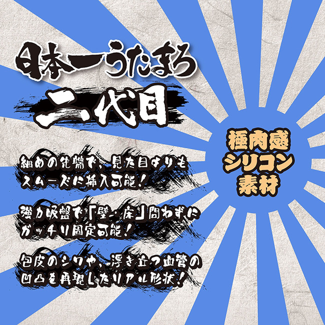 日本男児の伝統あるうたまろペニスを再現! 大きさ・長さ・形と日本一の「うたまろ」を再現したディルド!直立不動のドンとした勃ち振る舞いが思わず見とれてしまうほどの立派なディルドで、包皮や玉袋のシワ、浮き立つ血管などリアルに再現しております。長さはありますが先端はシュッとしているので挿入自体はスムーズにできますが、ピストンする度にカリ首や包皮のシワが擦り付け、心地よい刺激を与えてくれます。底部分には強力な吸盤が付いているので、壁や床に吸着して固定ができ、様々な体位でのプレイが可能です。日本男児の伝統ある、うたまろペニスを是非ご体験ください!