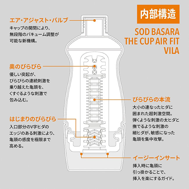びらびらのヒダに特化した内部構造。びらびらと連なったヒダと優しい突起が亀頭から根本へ押し寄せるように刺激。奥まで続く気持ちよさで、最速射精記録更新間違いなし!本体サイズ:7.4×7.4×18.7cm重量:156g